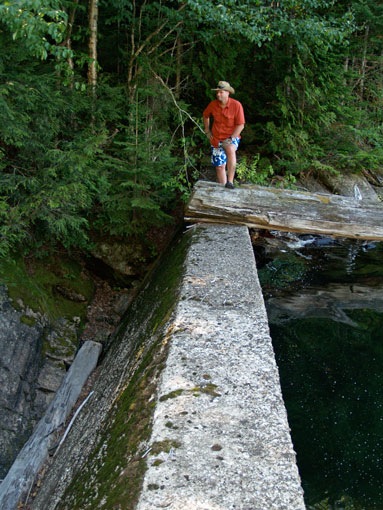 Next we paddled over to the dam. Walking onto the dam after having to bushwhack a little ways, we were astonished at the height of the dam. The vertical drop into McCraney Creek was pretty significant. The wall which was sloped as well, looked to be less than 10m, but more than 7m…Still that was over 20ft…probably about 25ft. We took a few pictures then left.